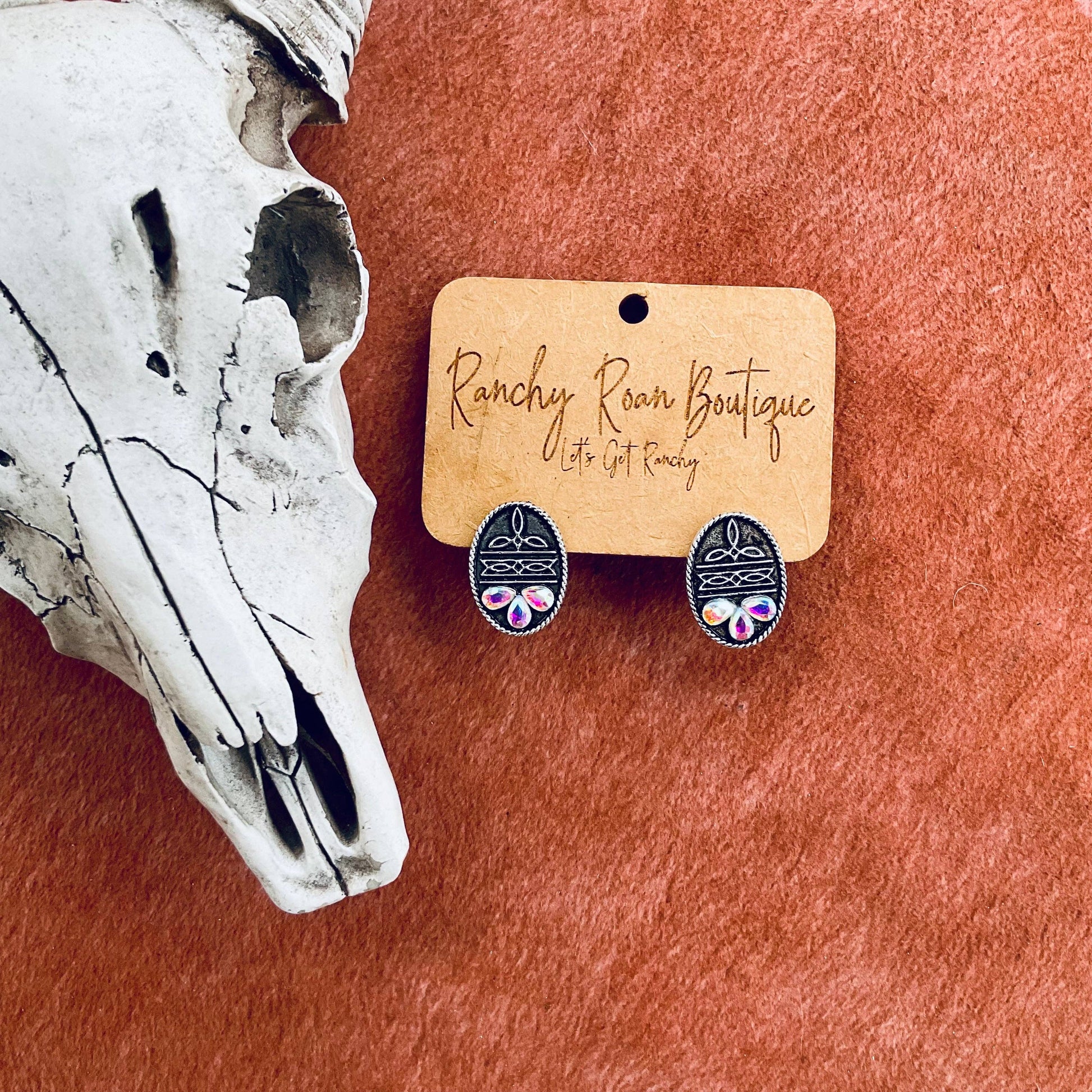 Elevate your jewelry lineup with the Western Boot Stitch Stone Stud Earrings. Featuring a detailed boot stitch-inspired design and shimmering stones, these studs bring a rustic yet refined touch to any outfit. • Engraved Boot Stitch Detail: Intricate Western-style etching adds a unique charm. • Iridescent Stones: Reflective accents catch the light for a subtle sparkle. • Lightweight & Comfortable: Perfect for all-day wear.